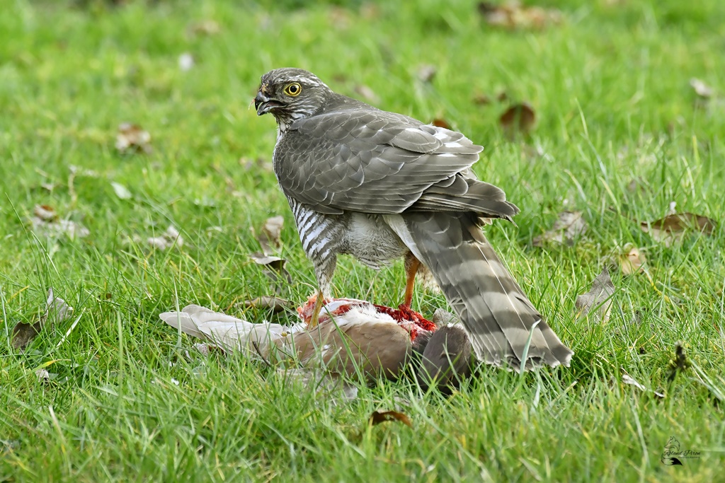 Épervier d’Europe femelle mangeant un pigeon le 2/04/2025